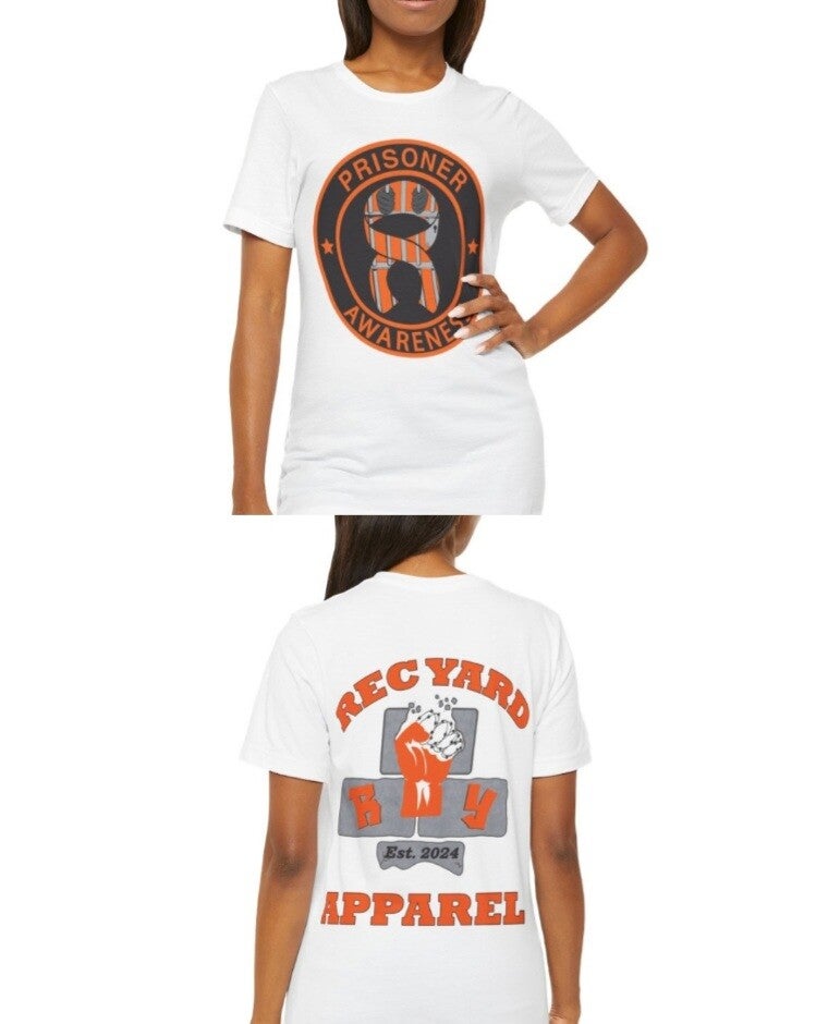 Step into solidarity with the Prisoner Awareness Ribbon T-shirt by Rec Yard Apparel. This exclusive design features a bold prison ribbon graphic paired with powerful messaging to support prisoner awareness and reform. The front logo centers the movement’s theme, while the back proudly displays the Rec Yard Apparel brand and a raised fist symbolizing strength and resilience.